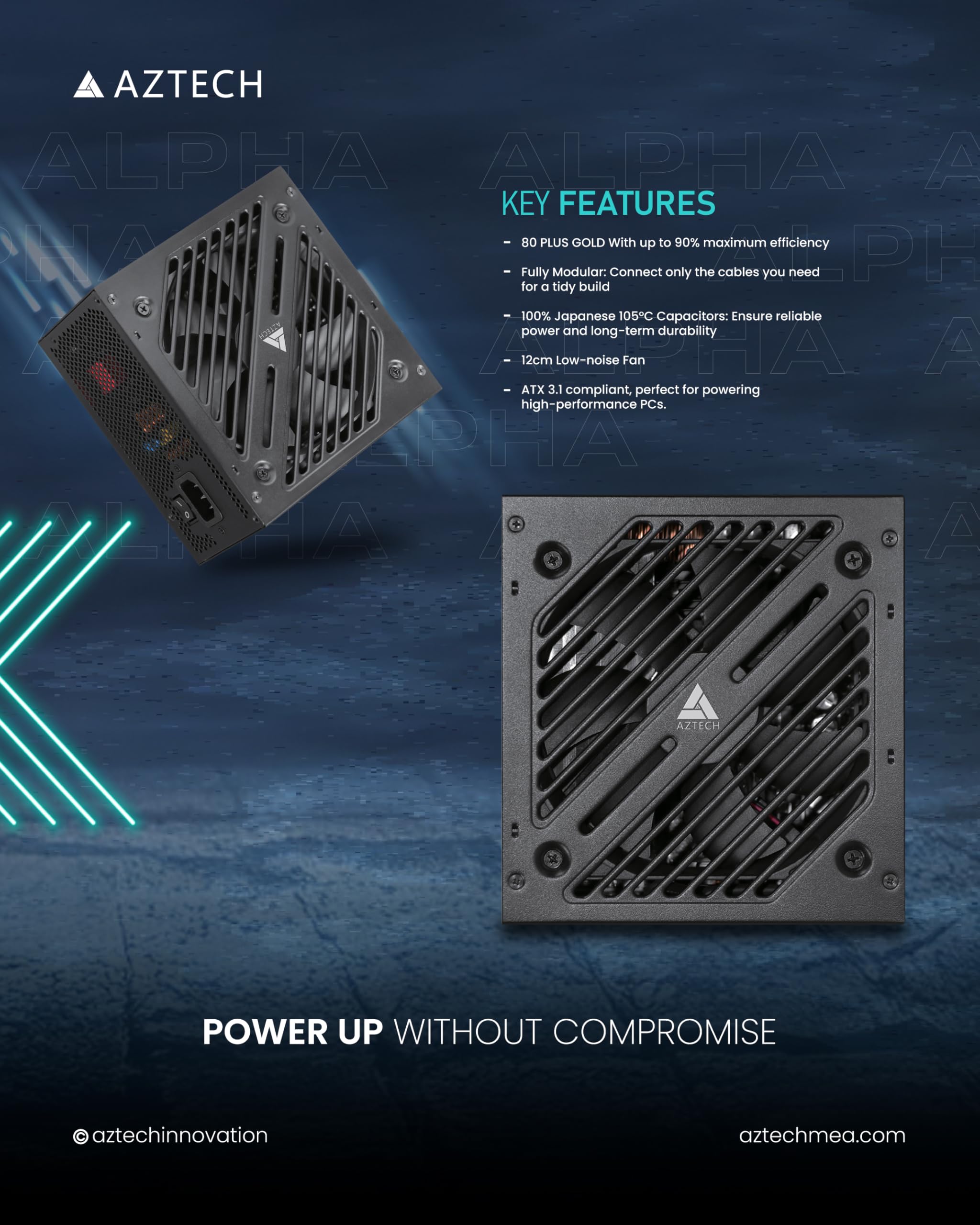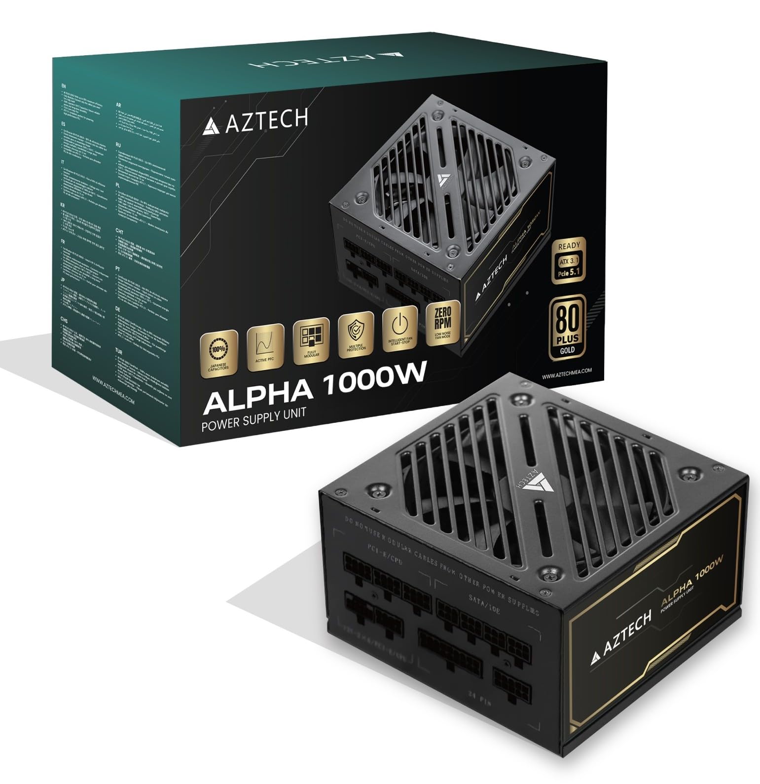 AZTECH ALPHA 1000W 80 Plus Gold ATX 3.1 & PCIe 5.1 Ready Fully Modular Power Supply Ultra‑Quiet Hybrid Fan PSU 120 mm, Japanese 105 °C Caps, Start‑Stop RPM Control RTX 40 PSU & Ryzen & IntelDhs. 449.10Dhs. 599.00