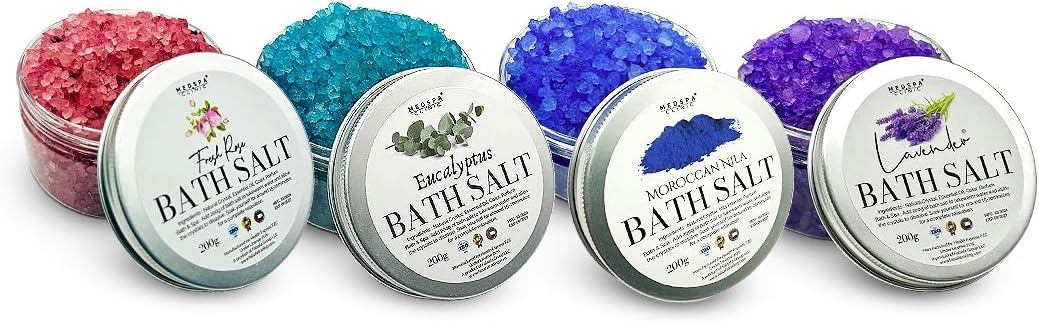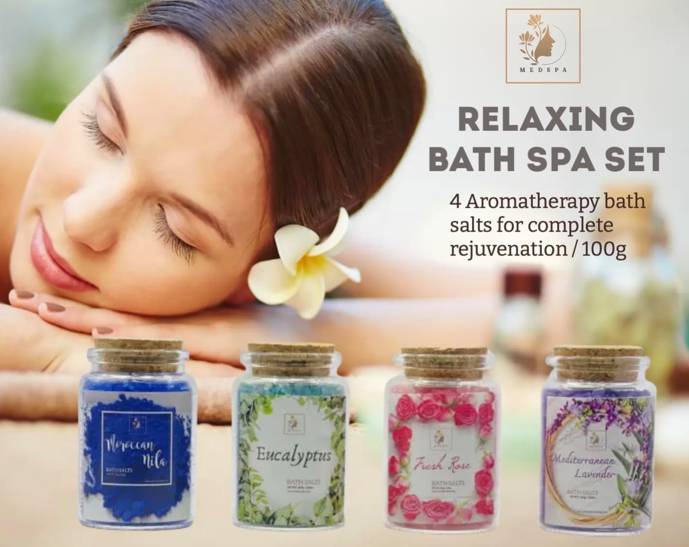 MEDSPACLINIC Aromatherapy Bath Salts Pack of 4 Relaxing Salts Rose, Eucalyptus, Moroccan Nila, Mediterranean Lavender for Soaking, Relaxing Bath Spa Set 200g each.