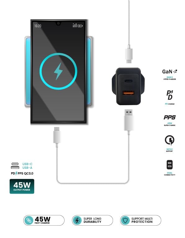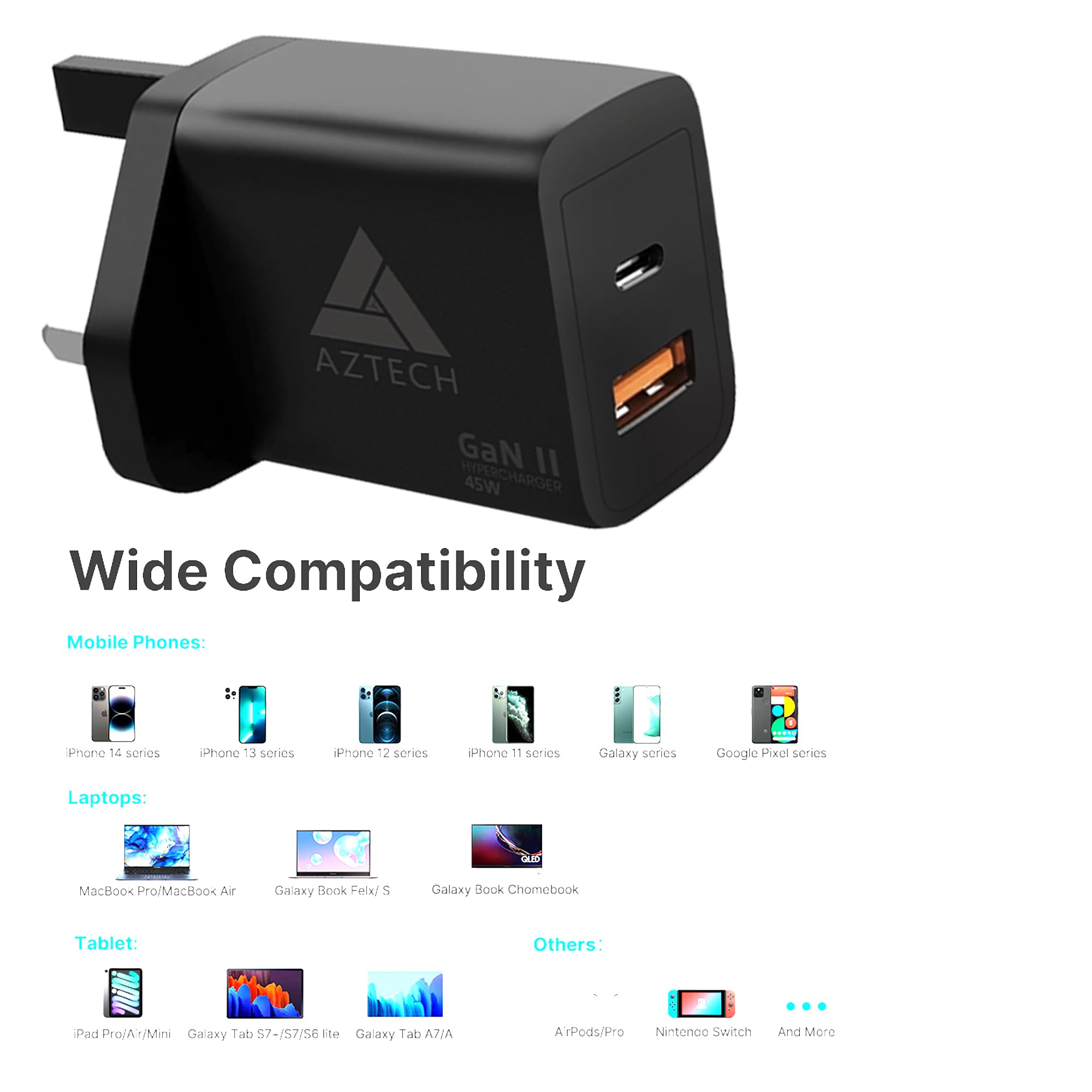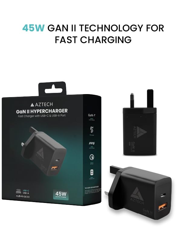 AZTECH HyperCharger 45W GaN II Dual Port Wall Charger USB-C & USB-A Fast Charging Adapter for iPhone 16 Pro Max/15/14/13, Galaxy S25 Ultra/S24/S23/S22, MacBook Air, iPad, LaptopsDhs. 79.00Dhs. 119.00