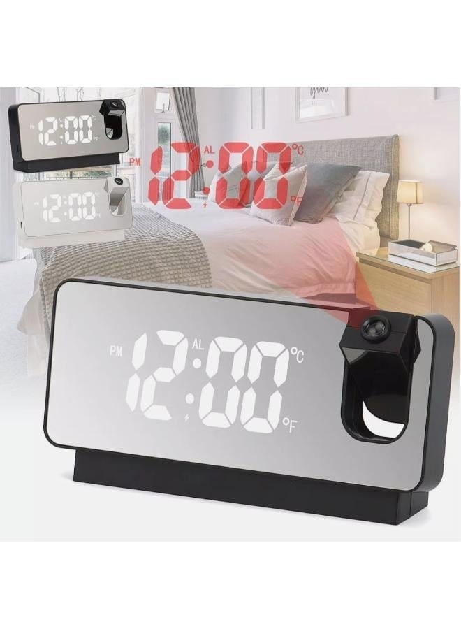 CLEAR & PRETTY DIGITAL PROJECTION ALARM CLOCK FOR YOUR BEDROOM: A simple styled electric projection clock that easy to match the decoration of your bedroom, features a clear LED display that easy to read with a pretty mirrored screen, allows you to easily know the time when leisurely lying on bed or when raising your eyes from work. . 180° ADJUSTABLE SWIVEL PROJECTOR: The projection alarm clock has a 180 degree rotatable projector to make it project time / date / temperature onto the ceiling or wall. · TIME, DATE & TEMPERATURE DISPLAY: The projection clock can display time in 12/24H format, date and the temperature of your room in ℃/℉ format. · ADJUSTABLE BRIGHTNESS & AUTO DIM AT NIGHT TIME: The alarm clock is dimmable in 2 brightness levels that you can adjust it to a bright or a dim display and it has a night mode that automatically dims between 18:00-6:00. · EASY TO SET & USER-FRIENDLY: The projection clock is equipped with a manual and a USB cable, easy to set up and easy to use, suitable for adults, kids and elders and can bring more easiness to your life. · BATTERY BACKUP FOR TIME MEMORY: It has a battery backup for the time memory function.