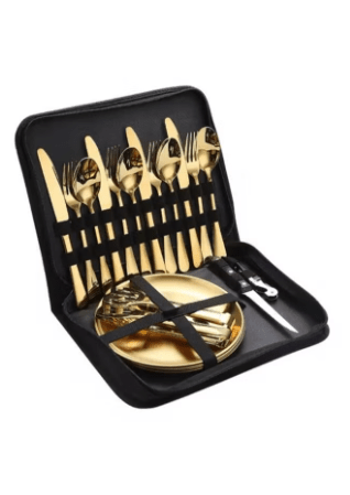 - تتضمن هذه المجموعة الكاملة أطباقًا وأدوات مائدة مطلية بالذهب، تُضفي لمسةً من الأناقة والفخامة على مائدتك. صُنعت هذه الأطباق وأدوات المائدة المحمولة بدقةٍ وتصميمٍ راقي، وهي مصممةٌ خصيصًا للنزهات الخارجية والتجمعات الداخلية على حدٍ سواء.