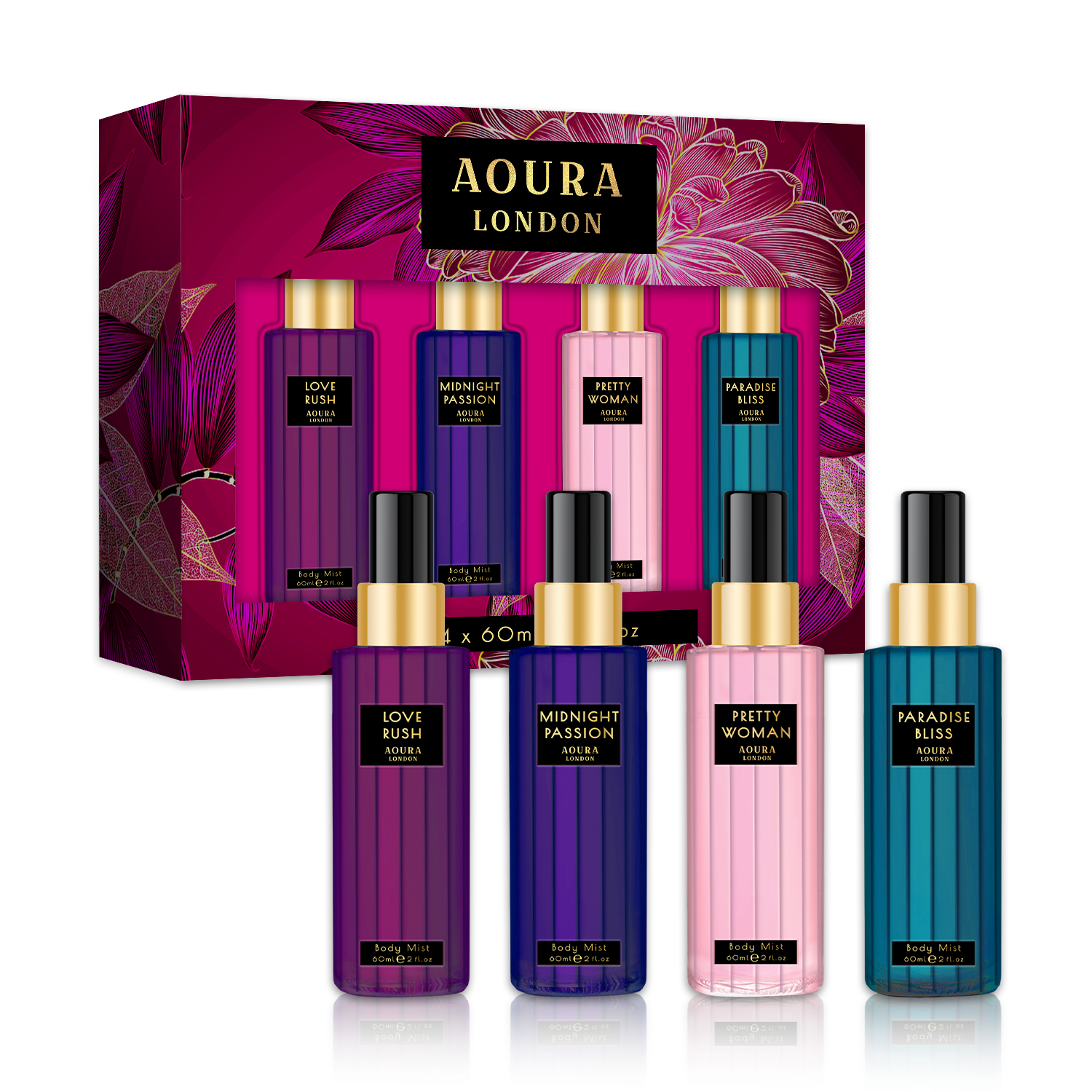 مجموعة هدايا معطر الجسم للنساء من مجموعة AOURA LONDON، مع شغف منتصف الليل، وحب راش، وامرأة جميلة، ونعيم الجنة، مجموعة بخاخ عطري (4 × 60 مل)
