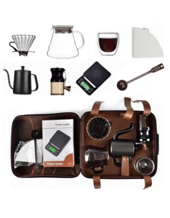 طقم قهوة - 9 قطع مع حقيبة حمل محمولة، غلاية قهوة مع فلتر لتنقيط القهوة، فلتر، ميزان قهوة، كوب مزدوج الجدار، مطحنة قهوة يدوية TS-05