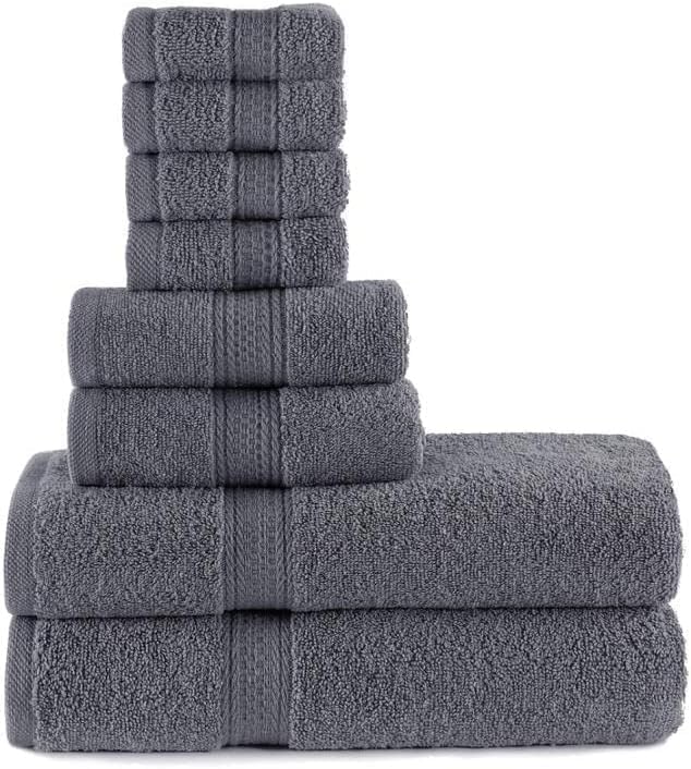 طقم مناشف مريح عالي الامتصاص، مصنوع من القطن الممشط بنسبة 100%، وزن 550 جرام لكل متر مربع، مكون من 8 قطع - رمادي