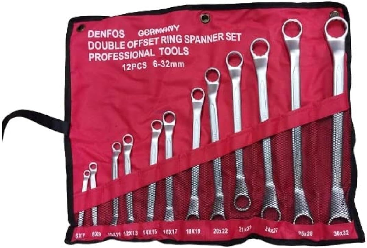 مجموعة مفاتيح ربط حلقية مزدوجة الإزاحة من دينفوس، مكونة من 12 قطعة - مقاسات مترية من 6 إلى 32 مم - مفتاح ربط فولاذي منفوخ بالرمل عالي القوة من نوع Cr-V مع حقيبة لفافة