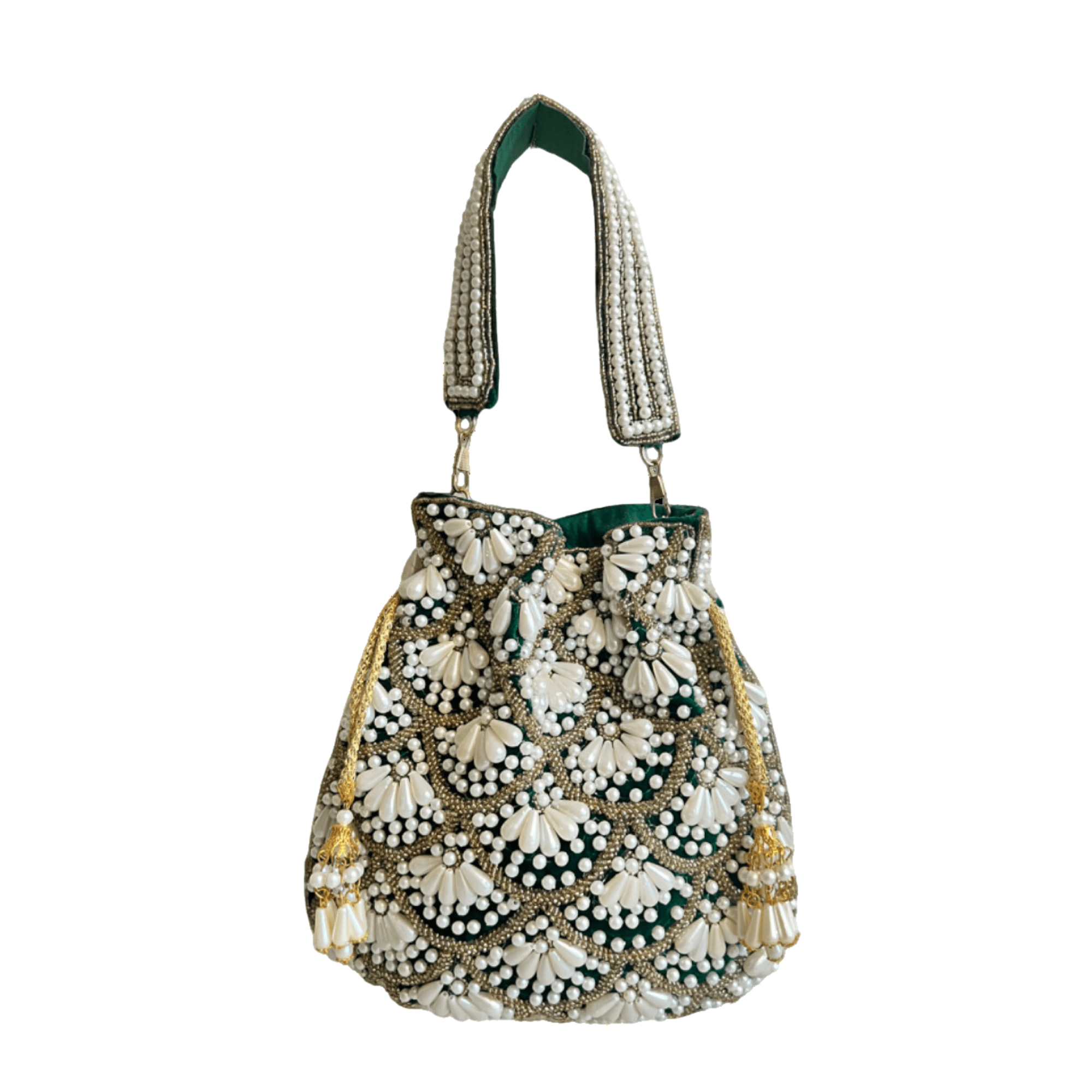 مزينة بتطريز رقيق ولآلئ لامعة، تُضفي هذه البوتلي لمسةً من الأناقة والسحر الخالدين. شكلها الصدفي الفريد يُضفي عليها لمسةً من الرقي، مما يجعلها الإكسسوار المثالي لحفلات الزفاف والحفلات والمناسبات الثقافية. بفضل مساحتها الداخلية الرحبة، تجمع بين الأناقة والعملية، مما يضمن لك حمل أغراضك الأساسية بسهولة. صُنعت هذه البوتلي يدويًا بعناية فائقة ودقة في التفاصيل، وهي رمزٌ حقيقي للحرفية والرقي. تألقي وتميزي بين الجميع بهذه القطعة الرائعة التي ستترك انطباعًا لا يُنسى أينما ذهبتِ.