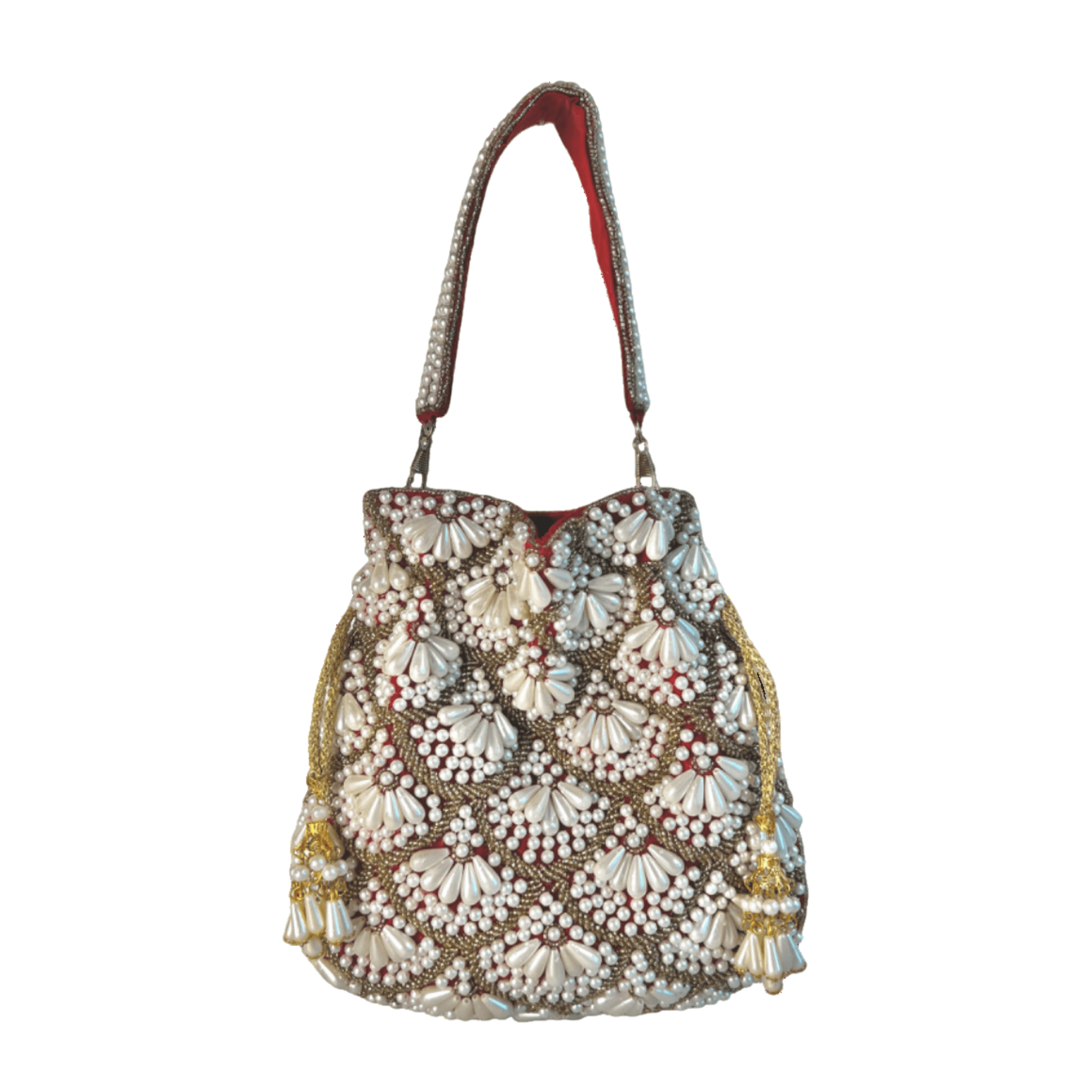 مزينة بتطريز رقيق ولآلئ لامعة، تُضفي هذه البوتلي لمسةً من الأناقة والسحر الخالدين. شكلها الصدفي الفريد يُضفي عليها لمسةً من الرقي، مما يجعلها الإكسسوار المثالي لحفلات الزفاف والحفلات والمناسبات الثقافية. بفضل مساحتها الداخلية الرحبة، تجمع بين الأناقة والعملية، مما يضمن لك حمل أغراضك الأساسية بسهولة. صُنعت هذه البوتلي يدويًا بعناية فائقة ودقة في التفاصيل، وهي رمزٌ حقيقي للحرفية والرقي. تألقي وتميزي بين الجميع بهذه القطعة الرائعة التي ستترك انطباعًا لا يُنسى أينما ذهبتِ.