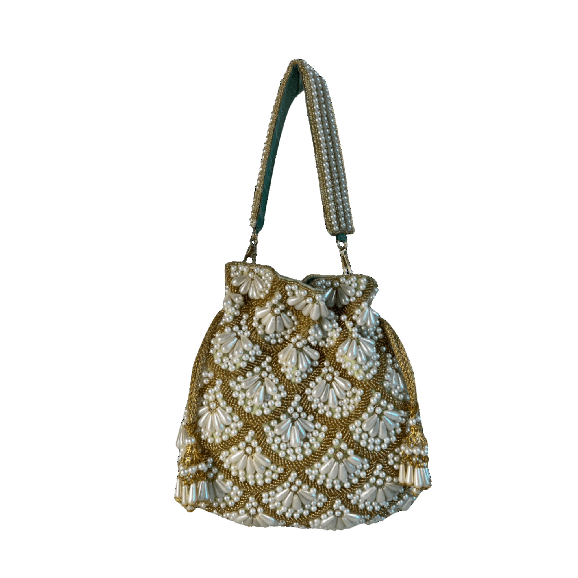 مزينة بتطريز رقيق ولآلئ لامعة، تُضفي هذه البوتلي لمسةً من الأناقة والسحر الخالدين. شكلها الصدفي الفريد يُضفي عليها لمسةً من الرقي، مما يجعلها الإكسسوار المثالي لحفلات الزفاف والحفلات والمناسبات الثقافية. بفضل مساحتها الداخلية الرحبة، تجمع بين الأناقة والعملية، مما يضمن لك حمل أغراضك الأساسية بسهولة. صُنعت هذه البوتلي يدويًا بعناية فائقة ودقة في التفاصيل، وهي رمزٌ حقيقي للحرفية والرقي. تألقي وتميزي بين الجميع بهذه القطعة الرائعة التي ستترك انطباعًا لا يُنسى أينما ذهبتِ.