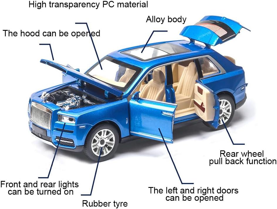 نموذج السيارة بنسبة ١/٢٤ يُشبه إلى حد كبير السيارة الحقيقية في المظهر، مما يُمكّن الأطفال من تعلّم معلومات صحيحة عن السيارة. مثالي للأولاد والبالغين المُولعين بسيارة رولز رويس كولينان، بحجم كبير ومظهر رائع.