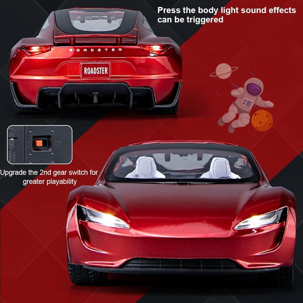 نموذج سيارة تيسلا رودستر من سبائك معدنية بمقياس 1:24 من EROCK، سيارة تيسلا قابلة للسحب مع أضواء وموسيقى، هدايا للأولاد والبنات. (أحمر)