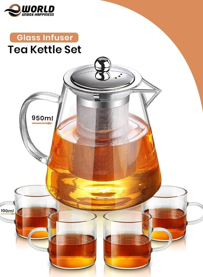 Eworld Glass Teapot Set with 4 Cups, 950ml Pot & Infuser, Heat-Resistant Handle, Stovetop & Microwave Safe, Elegant Design