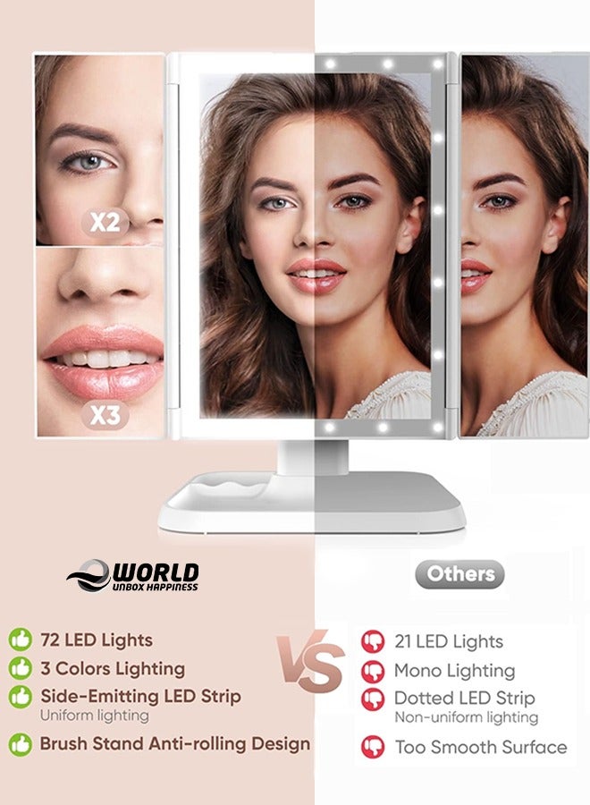 Eworld Trifold Lighted Makeup Mirror with 72 LEDs, 3 Color Modes, 1x/2x/3x Magnification, Touch Control, 90° Adjustable, Portable Vanity Mirror with Removable Storage Base (White)