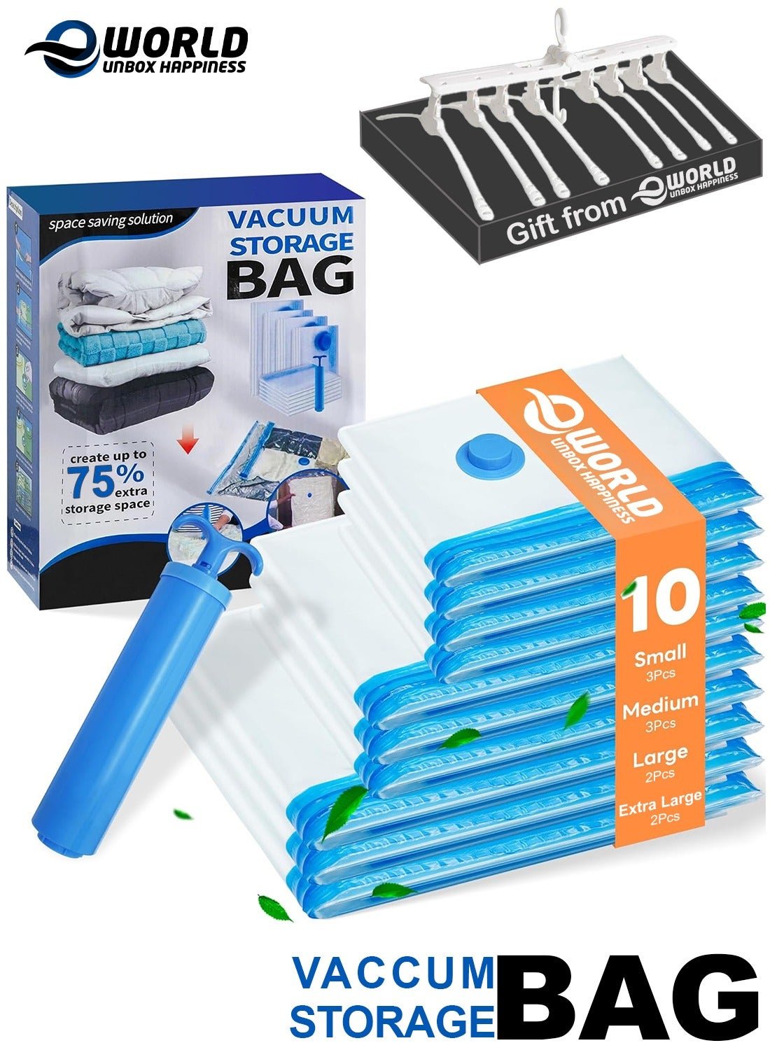 Eworld Vacuum Storage Bags with Hand Pump – Space-Saving Compression Bags for Clothes, Blankets, Comforters & Travel Organization, 10 Pcs with Gift Hanger