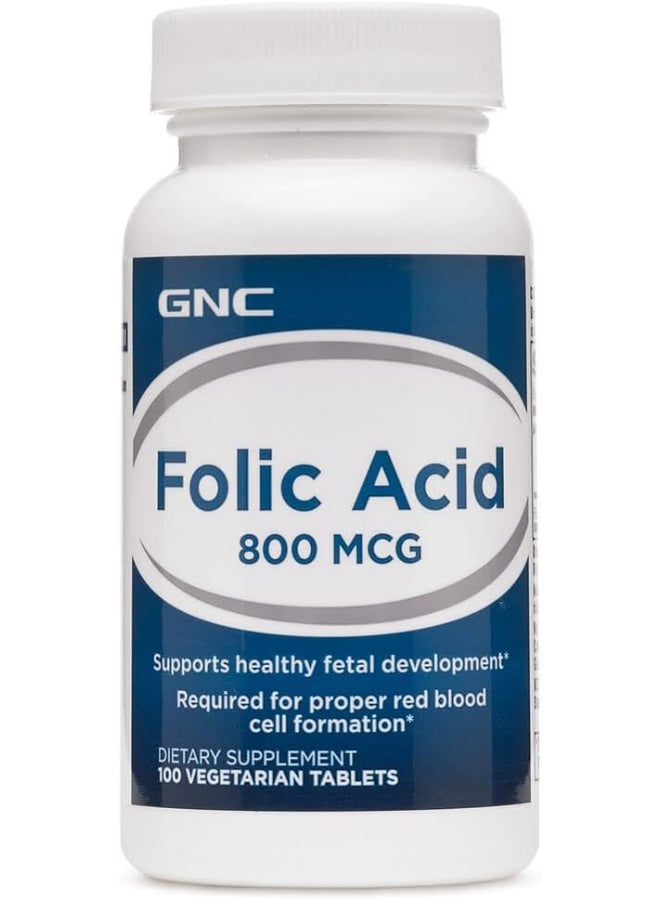 حمض الفوليك من جي إن سي - ٨٠٠ ميكروغرام يدعم نمو الجنين الصحي. ضروري لتكوين خلايا الدم الحمراء بشكل سليم. قد يقلل تناول كمية كافية من الفولات في نظام غذائي صحي من خطر إنجاب طفل مصاب بعيوب خلقية في الدماغ أو النخاع الشوكي. ١٠٠ قرص نباتي، إمداد لمدة ١٠٠ يوم، خالٍ من الغلوتين، كوشير.