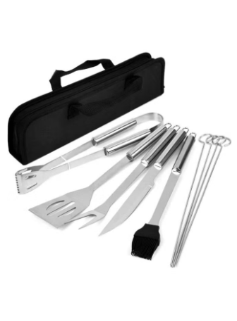 - توفر مجموعة الشواء 9 أدوات للشواء وحقيبة تخزين بمقبض، وتشتمل الأدوات على حقيبة تخزين، وملعقة شواء، وشوكة شواء، وسكين شواء، وملقط شواء، وفرشاة دهن، و4 أسياخ.