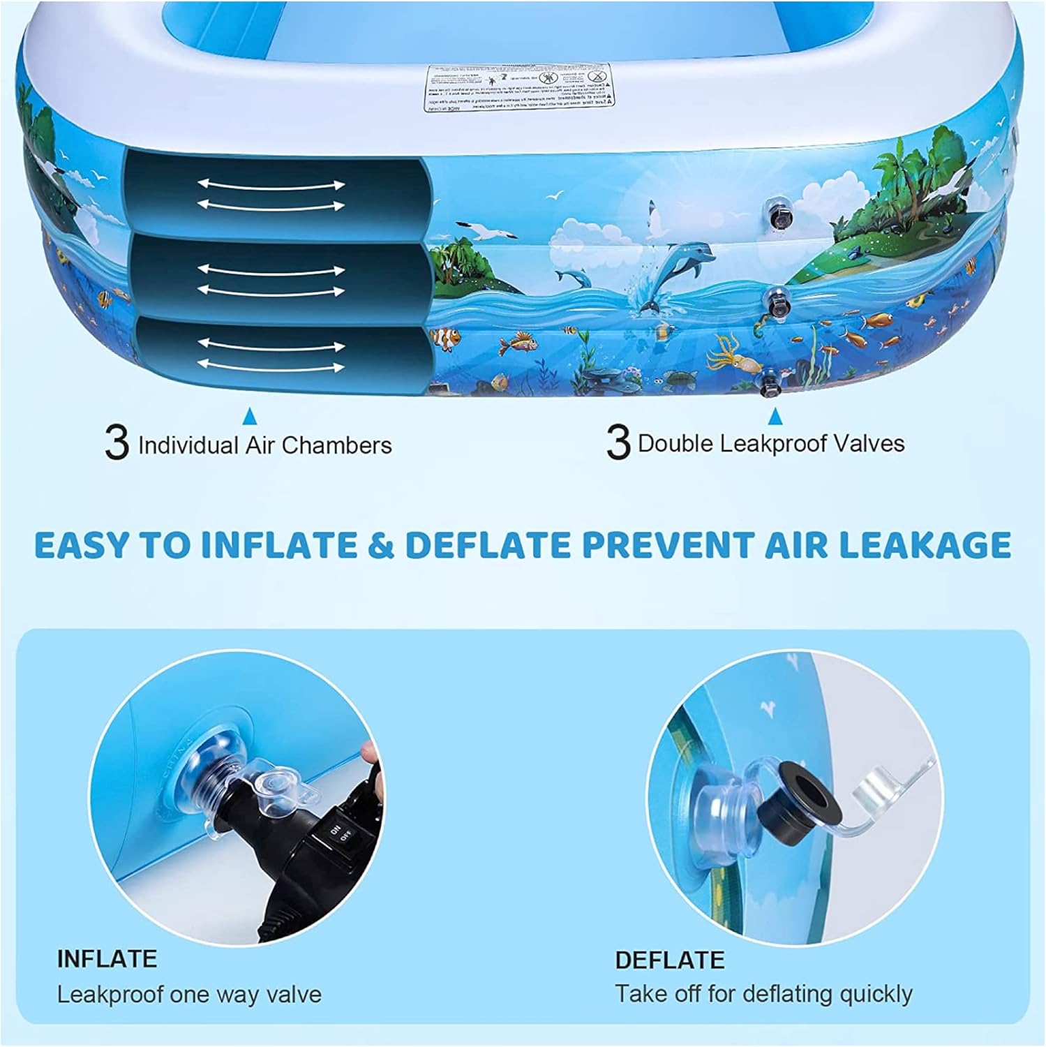 STABLE AND DURABLE: Made with heavy-duty PVC material, this inflatable pool is sturdy and stable, wear-resistant. 3 individual air chambers design make the swimming pool prevent air leakage and withstand extra weight, serves up tons of splashing water fun to your little one!