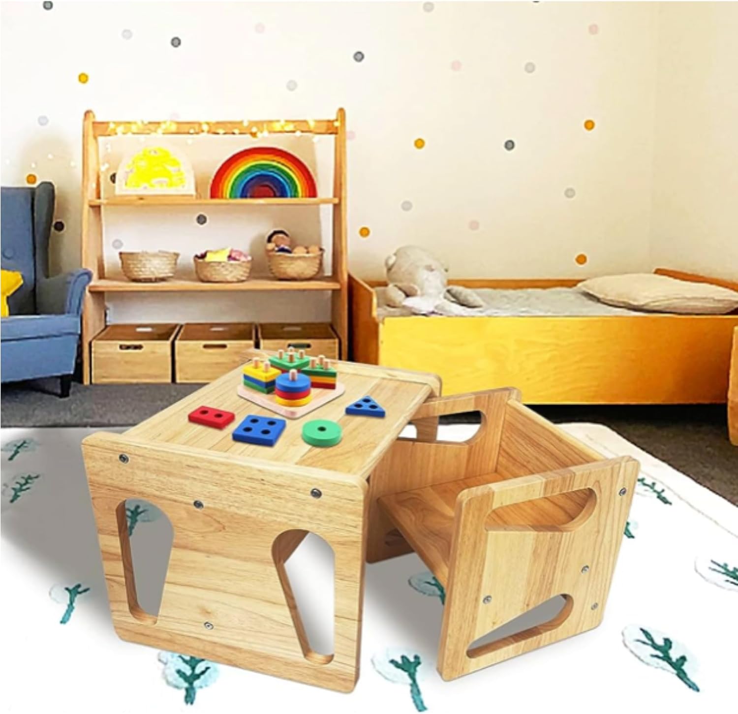 HEXAR Montessori Weaning Table and Chair Set 2 Pcs Real Hardwood Desk for Toddler Reading Snack Time Playroom Activity Cube Step Stool 1-4 Year Old Kids Montessori Furniture (SOLID WOOD – 2 PCS)