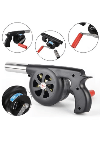 - المنفاخ مصمم بمقبض يدوي، ما عليك سوى هز المقبض، ليقوم التوربين الداخلي بتفريغ الهواء. استخدام المنفاخ يوفر وقت إشعال الفحم ويُسرّع عملية الشواء.