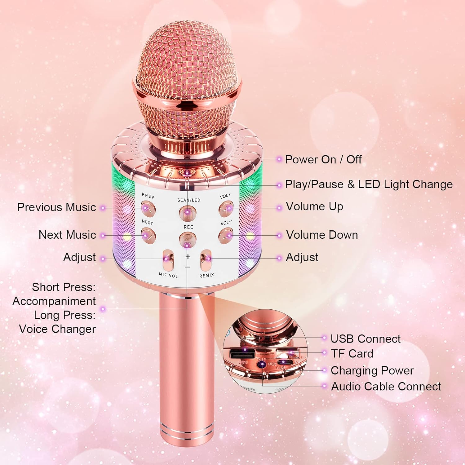 ميكروفون كاريوكي ميلرونغ للأطفال الذين يغنون، 5 في 1 ميكروفون لاسلكي يعمل بالبلوتوث مع أضواء LED، جهاز كاريوكي محمول، ميكروفون ومكبر صوت ومشغل مسجل للمنزل والحفلات وأعياد الميلاد (وردي)