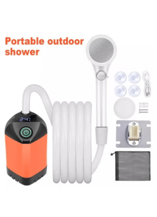 - دش التخييم خفيف الوزن وصغير الحجم، ويأتي مع حقيبة تخزين مجانية. يتضمن أنبوب ماء سميك من البولي فينيل كلوريد بطول مترين، ورف دش، ورأس دش، وكابل شحن USB.