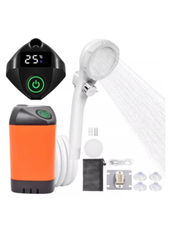 - دش التخييم خفيف الوزن وصغير الحجم، ويأتي مع حقيبة تخزين مجانية. يتضمن أنبوب ماء سميك من البولي فينيل كلوريد بطول مترين، ورف دش، ورأس دش، وكابل شحن USB.