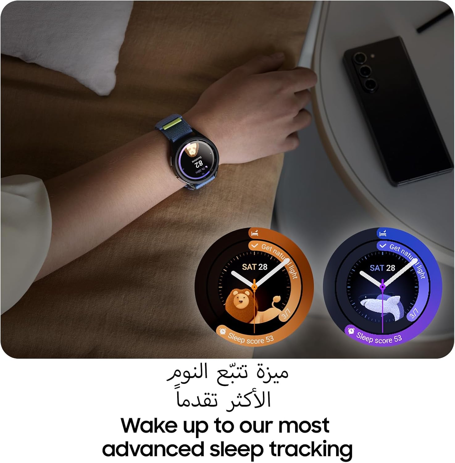 تتبع النوم: تعرف على نومك باستخدام ساعة Samsung Galaxy الذكية هذه ومتتبع النوم المتقدم الخاص بها، وفهم أنماط ومراحل نومك (الاستيقاظ، والضوء، وحركة العين السريعة العميقة)، واحصل على تدريب على النوم من أجل عادات نوم صحية.