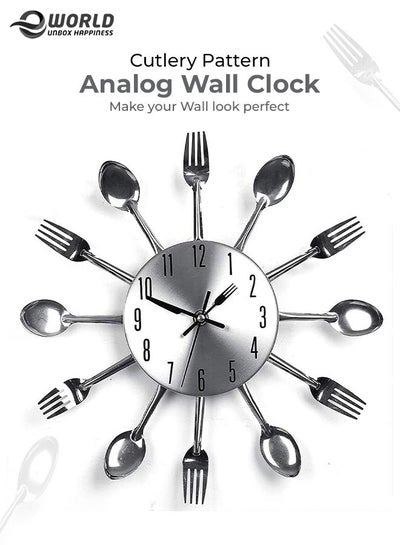 ساعة حائط تناظرية بنمط أدوات المائدة من الفولاذ المقاوم للصدأ لديكور المنزل والمطبخ