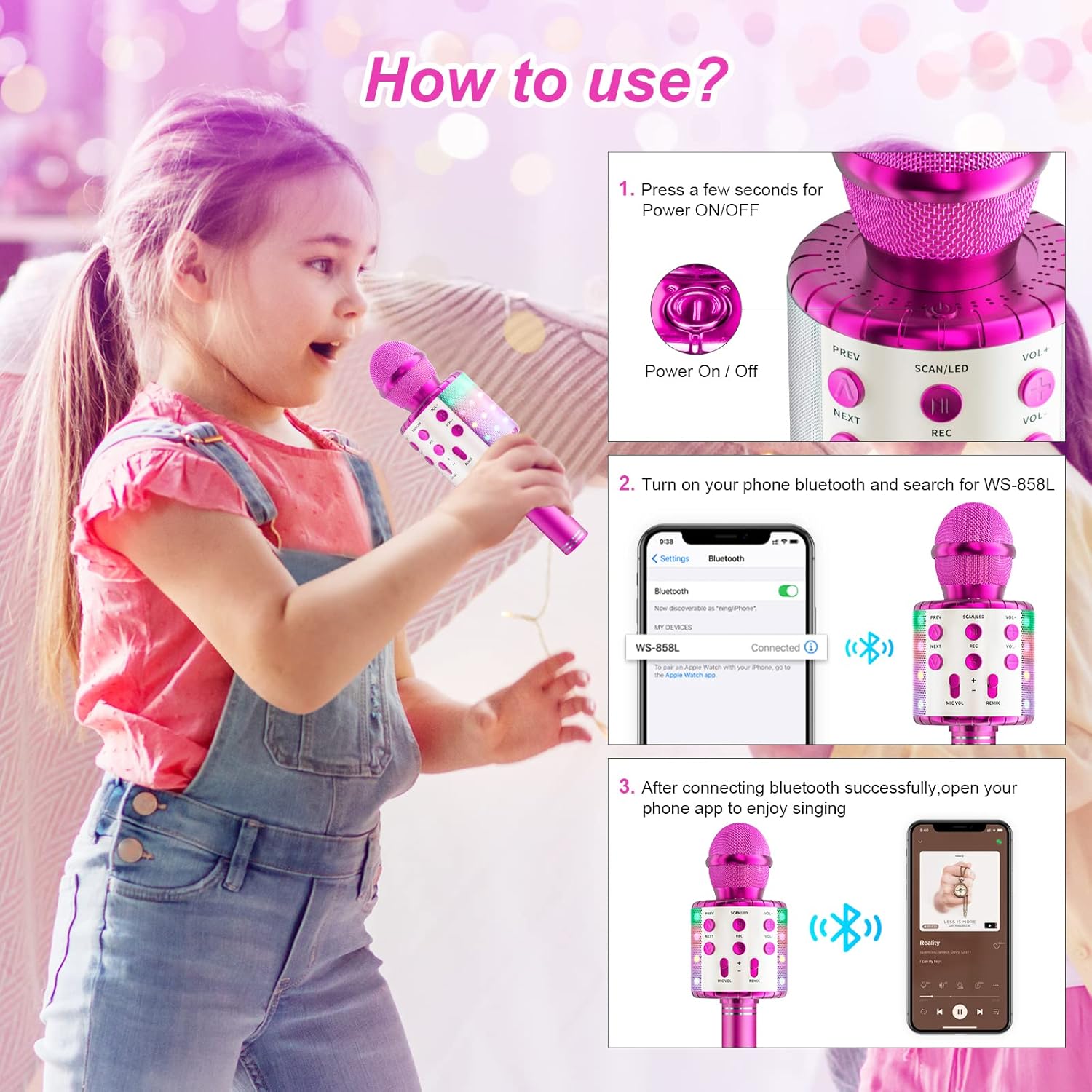 🎵【هدية رائعة للأطفال والكبار】يتميز هذا الميكروفون المتغير للصوت بمظهر أنيق ومشرق بإضاءة LED. هذا ميكروفون كاريوكي مثالي للأطفال من سن 4 إلى 12 عامًا، أفضل هدايا عيد ميلاد ممتعة للمراهقين والبنات والأولاد من سن 5 إلى 11 عامًا. أفضل هدايا الاختيار لجميع أنواع المهرجانات مثل عيد الفصح والكريسماس وعيد الحب والهالوين وعيد الشكر ورأس السنة الجديدة.