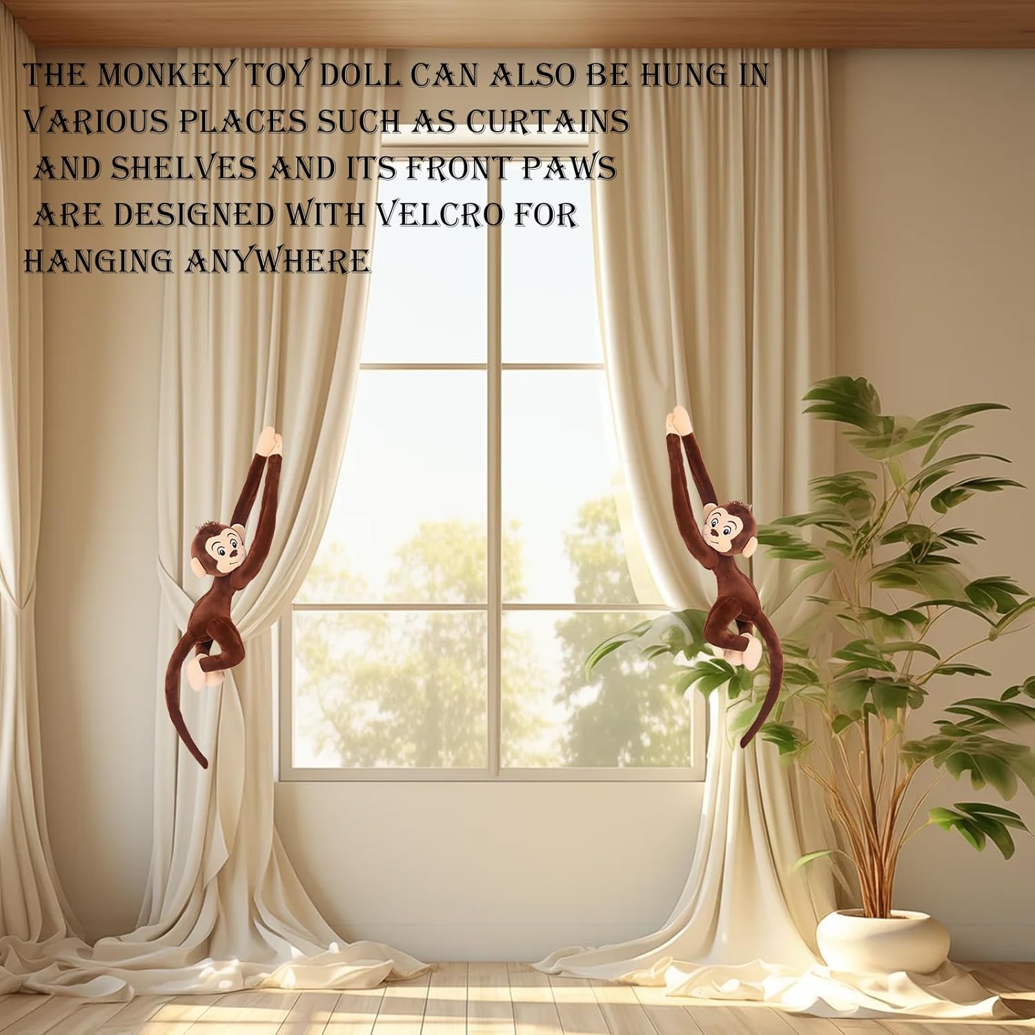 تُستخدم على نطاق واسع: تُعدّ حيوانات القرد المحشوة مثالية لتزيين غرفة نوم أطفالكم، أو مكتبهم، أو غرفة معيشتهم، أو مكتبهم، أو وضعها على الأسرّة، أو الأرائك، أو الطاولات، أو الرفوف. يُضفي حيوان القرد المحشو المُعلّق ذو الأيدي الطويلة المزيد من البهجة والمرح. يُمكن تعليقه على ستائر النوافذ، أو حتى حول رقبتكم كزينة للعطلات. تُضفي لمسات العيد المميزة، مع وسائد الموز، لمسةً مميزةً على أجواء الهالوين.