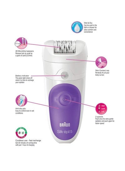 Silk Epil 5 Wet And Dry Cordless Epilator With Attachment Set White/PurpleDhs. 248.87Dhs. 270.00