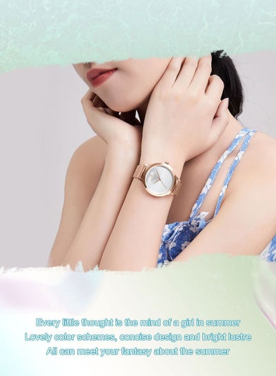 DESIGN INSPIRATION:Collect colorful vitality to kick off the midsummer and,Freeze bright colors and the refreshing design into your wrist,Awake the trend inspiration of vibrant summer,Come to a surprise encounter with cool styling, METAL BRACELET BRINGS YOU A FRESH SUMMER,When you put this watch on your wrist,The exquisite and soft Milanese woven bracelet,Helps you keep the sweet time of wonderful summer, GLITTERY DIAL MAKES YOU MORE SHINY,Well combination of CD pattern and horizontal pattern,Makes this watch more outstanding of its sense of metallic glow.,Glittering with changing light on the surface,It creates a highly recognizable summer style., ANTI-SKIDDING CROWN,Delicate diamond shaped crown makes it more easily to adjust time., HARDENED MINERAL GLASS,High transparency, durable, and scratch-resistant, 3ATM WATERPROOF,Prevent the hand washing, rain splashing, etc. from causing watches to enter the water in daily life.,