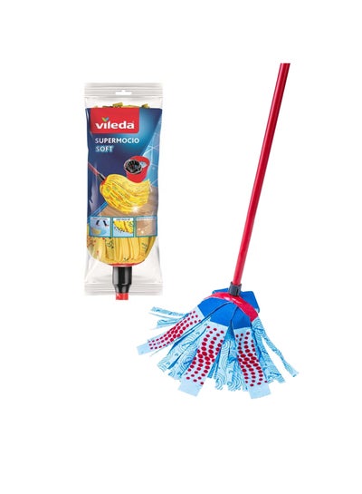 3-Action Cleaning Mop With Stick Red/Blue & Supermocio Soft Floor Mop Refill