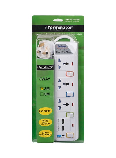 3 Way Power Extension Socket With 2 USB Port White 3meter