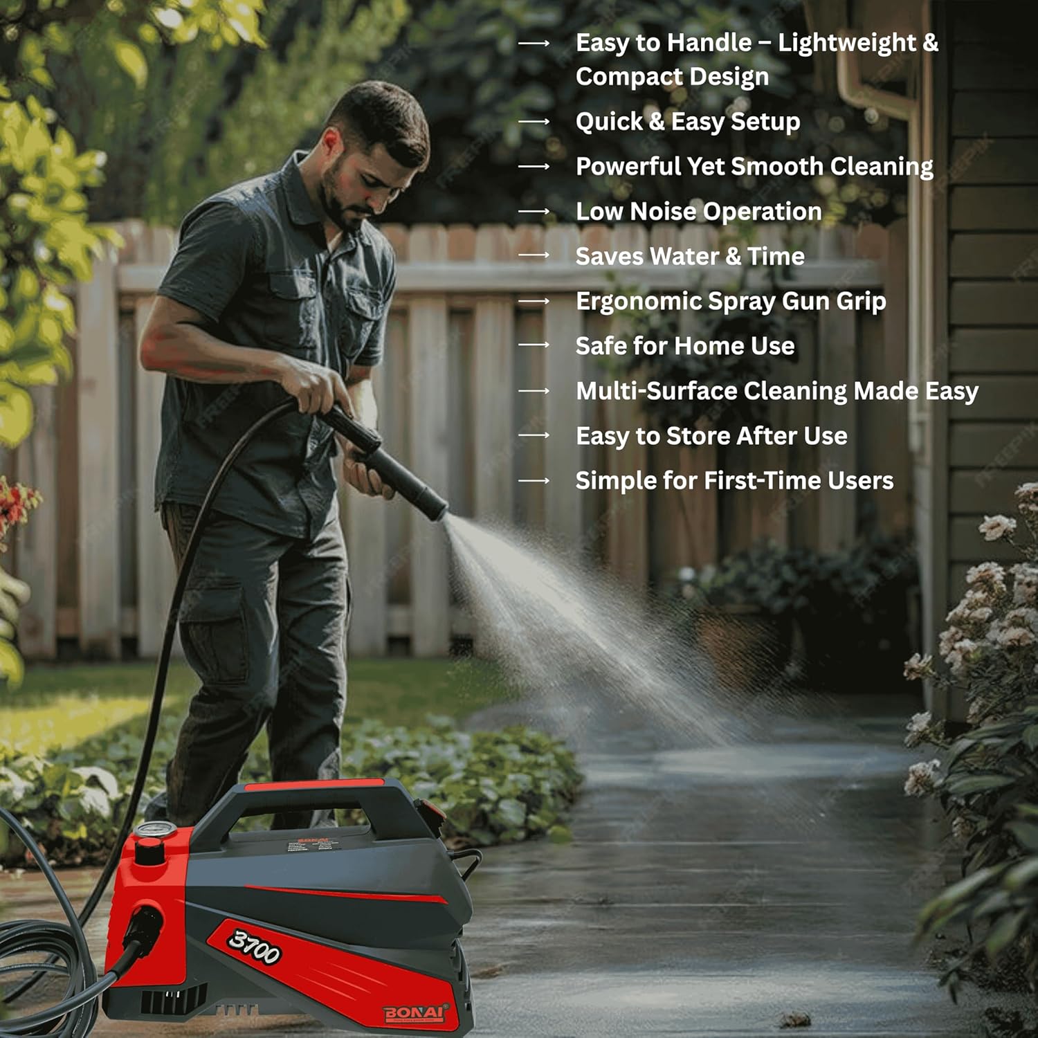 Powerful 3700W Motor – Delivers strong water pressure with 10L/min flow rate and 300MPa cleaning power, perfect for cars, patios, walls, and driveways.