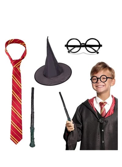 Package includes:, 1 * Harry Potter Costume Robe, 1 * Striped Tie, 1 * Harry Potter Eye-Glasses Frame (NO lenses), 1 * Wizard hat, 1 * Harry Potter Wand (no light)