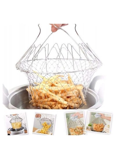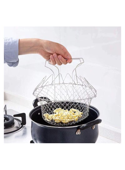 This folding cooking basket opens up into a hanging-style basket that fits perfectly into your pots and pans. Boil pasta, rinse vegetables fruits, or fried potatoes, chicken and other fried foods. Simply lift up to drain. Invert the basket to use as a steamer or flip the handles downward to use as a standing colander.