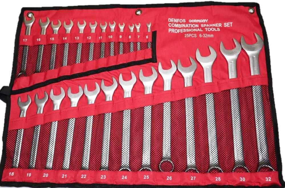 Denfos Combination Wrench Set 25 Pcs (6mm-32mm) The Set Contains Spanner Sizes 6mm,7mm, 8mm, 9mm, 10mm, 11mm, 12mm, 13mm, 14mm, 15mm, 16mm, 17mm, 18mm, 19mm, 20mm, 21mm, 22mm, 23mm, 24mm, 25mm, 26mm, 27mm, 28mm, 30mm, 32mm, Denfos wrenches, precisely machined, made of chrome vanadium alloy steel, with well surface polished, assure that the dimensions of both open and ring end