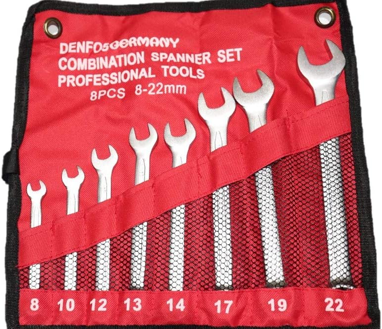 Denfos Combination Wrench Set 8 Pcs (8mm-22mm), The Set Contains Spanner Sizes 8mm, 10mm, 12mm, 13mm, 14mm,17mm, 19mm, 22mm, Denfos wrenches, precisely machined, made of chrome vanadium alloy steel, with well surface polished, assure that the dimensions of both open and ring end