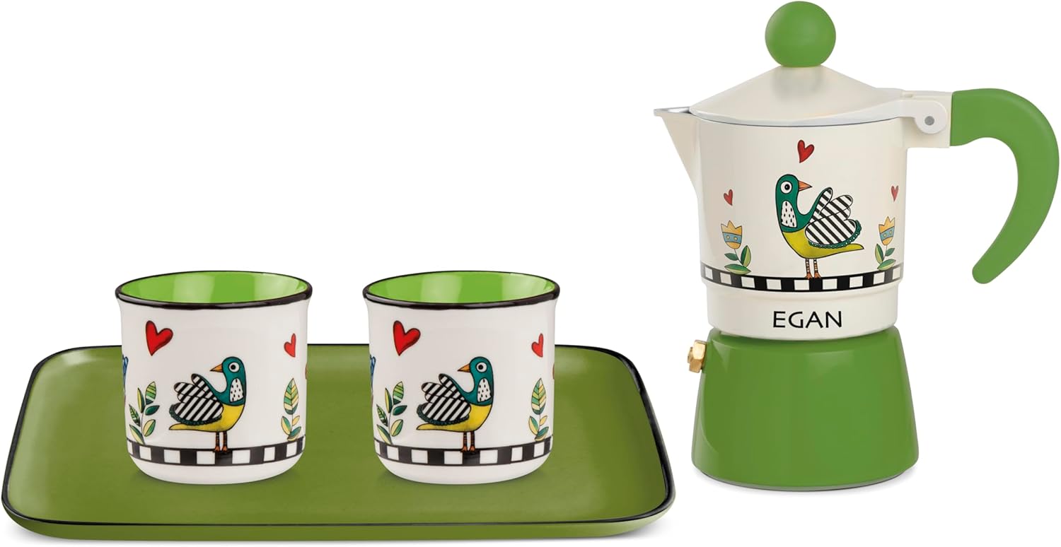 Egan Set Moka Coffee Maker, 2 Mini Mugs, and Tray Cocoricò Green – Premium Aluminum and New Bone China