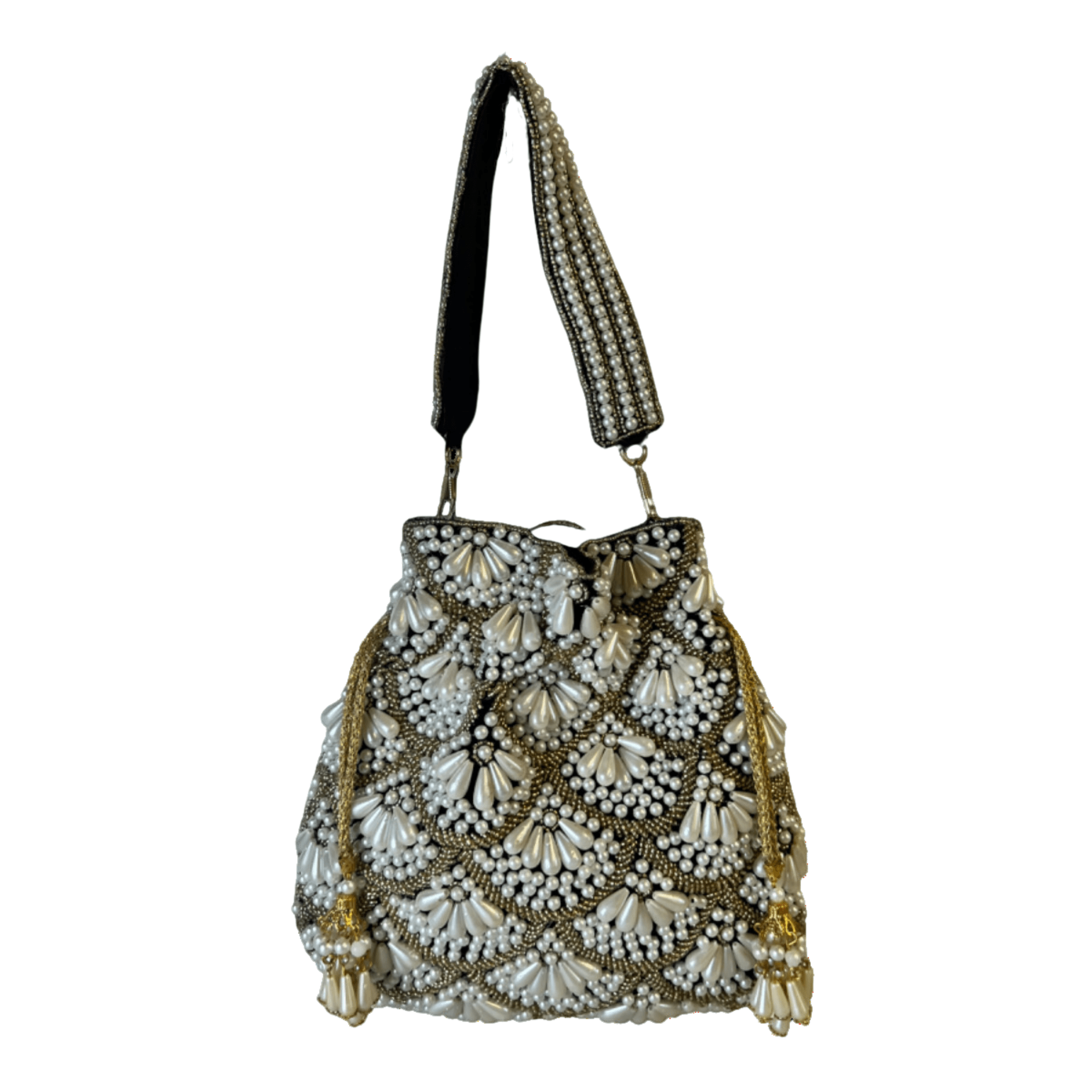 Adorned with delicate embroidery and lustrous pearls, this potli exudes timeless elegance and charm. Its unique shell shape adds a touch of sophistication, making it the perfect accessory for weddings, parties, and cultural events. With its spacious interior, it offers both style and practicality, ensuring you can carry your essentials with ease. Handcrafted with care and attention to detail, this potli is a true symbol of craftsmanship and refinement. Make a statement and stand out from the crowd with this stunning piece that will leave a lasting impression wherever you go.
