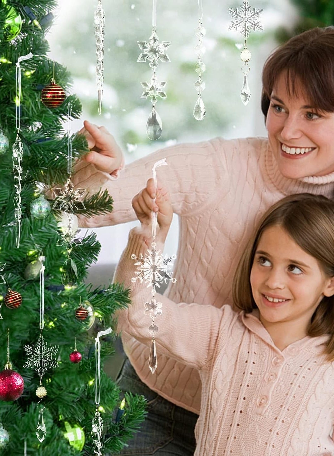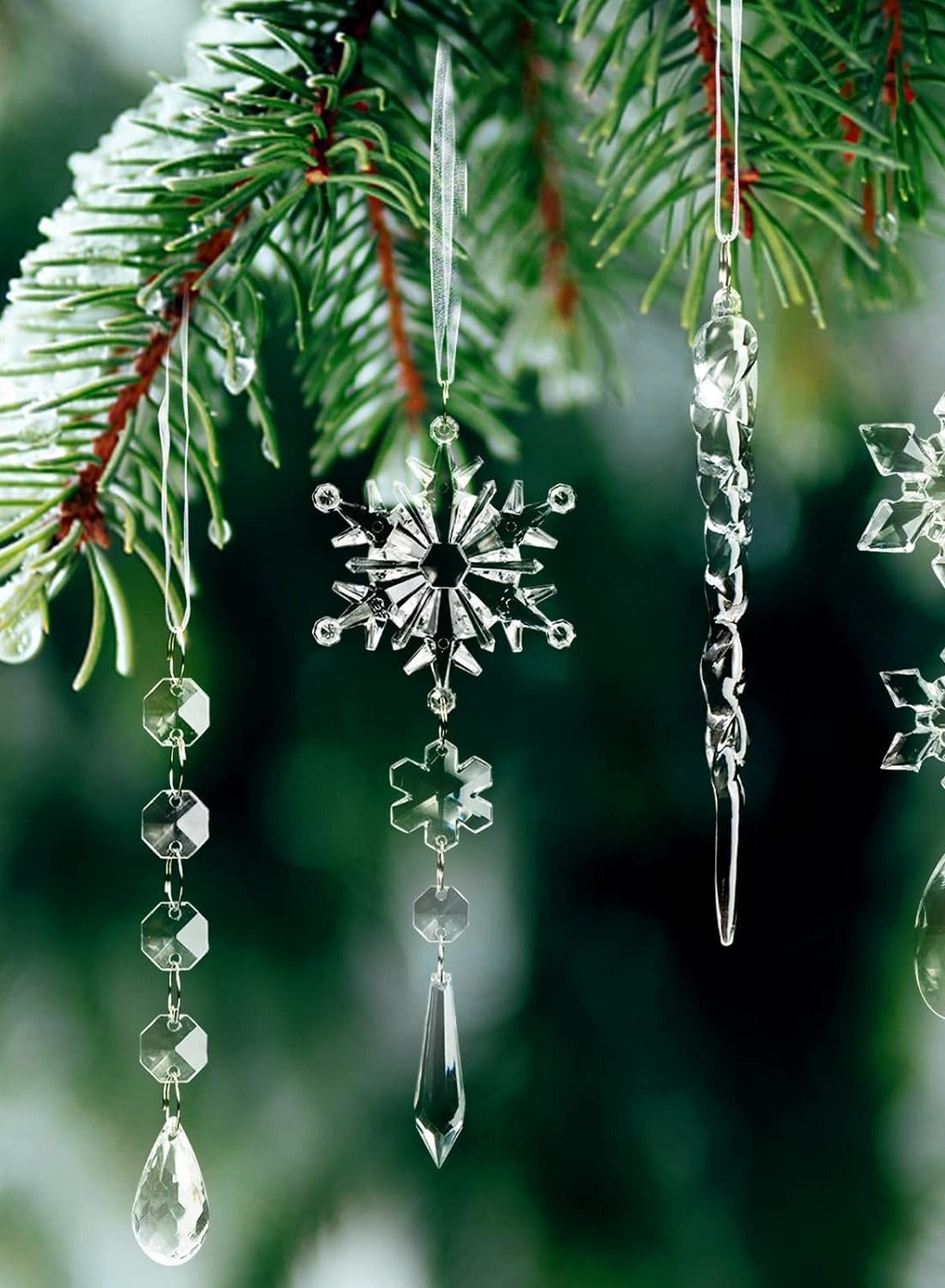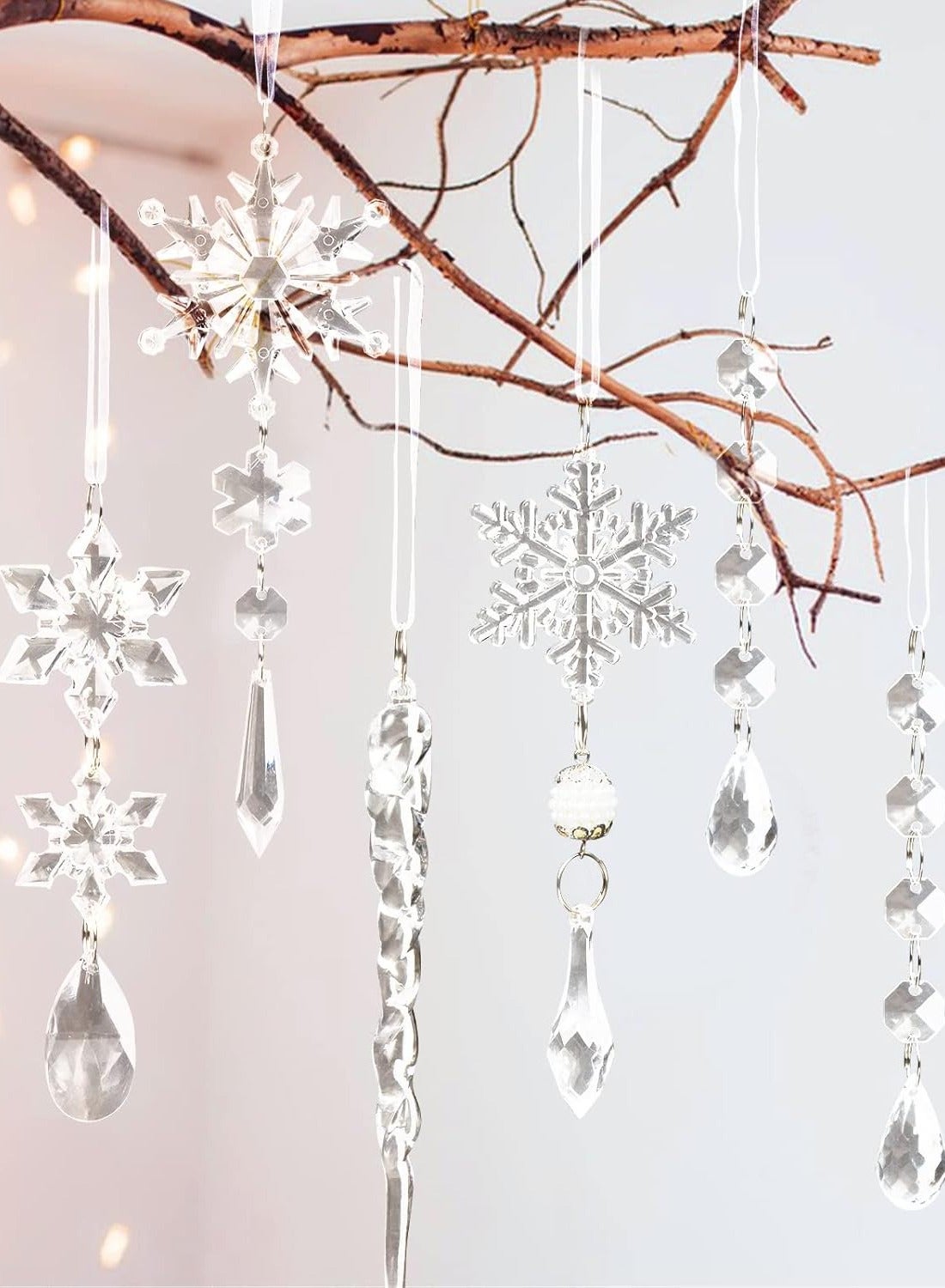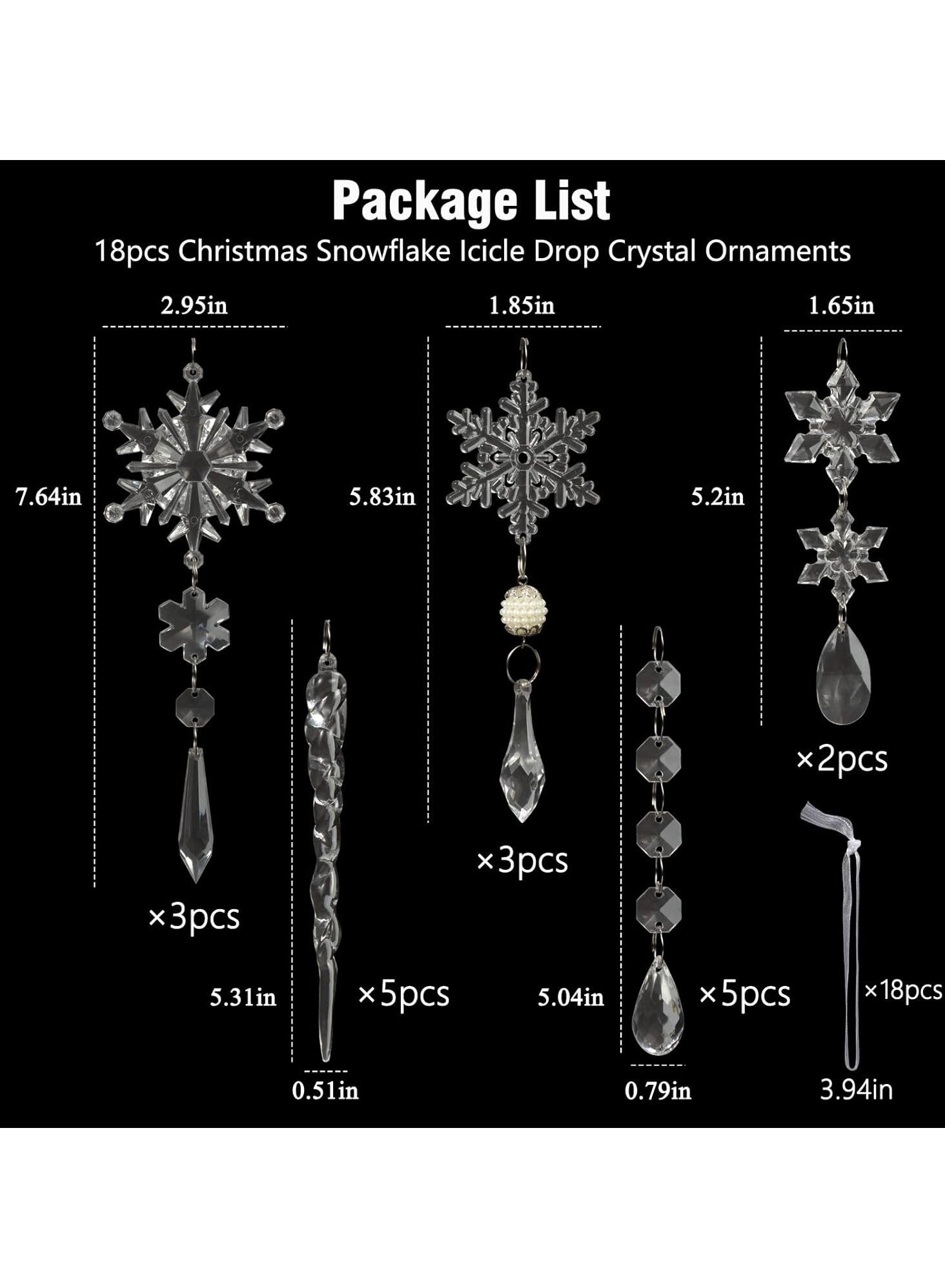 Eworld 18-Piece Christmas Tree Crystal Ornaments Set in 5 Unique Styles, Elegant Hanging Acrylic Snowflake and Icicle Decorations with Silver Strings, Perfect for Winter Holiday Decor and New Year Party Supplies