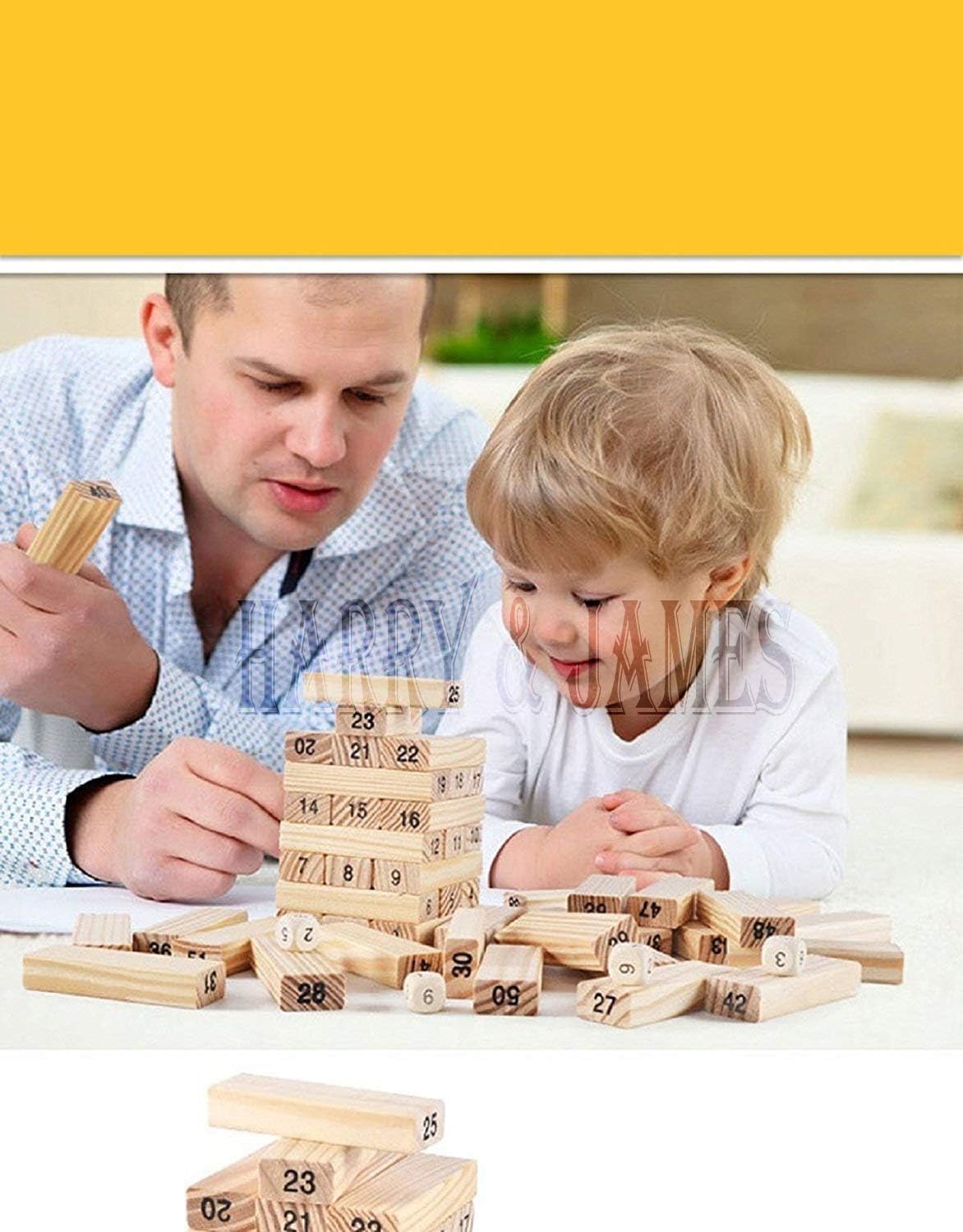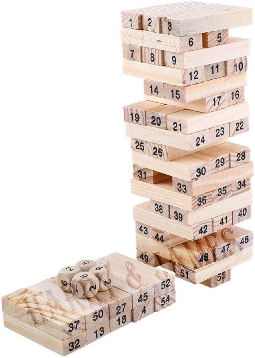 HARRY & JAMES® Wooden Building Blocks Puzzle 54 Pcs Challenging 4pcs Dice Wooden Blocks Stacking Game Maths,Tumbling Tower 54 Pcs with 4 Dices Game for Adults & Kids.