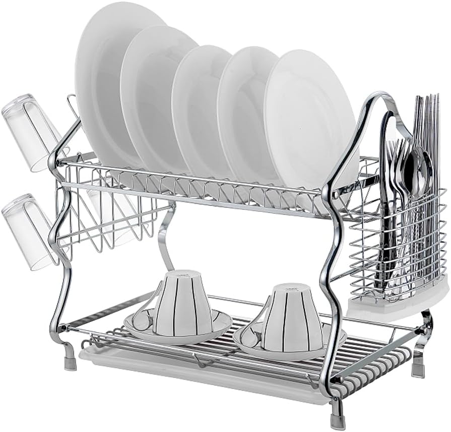 HEXARHEXAR 2 Tier Dish Drying Rack with Drainboard, Premium Steel Dishracks for Kitchen Counter, Dish Organizer Removable Cup Holder Utensils Holder (2 Tier Silver)Dhs. 78.72