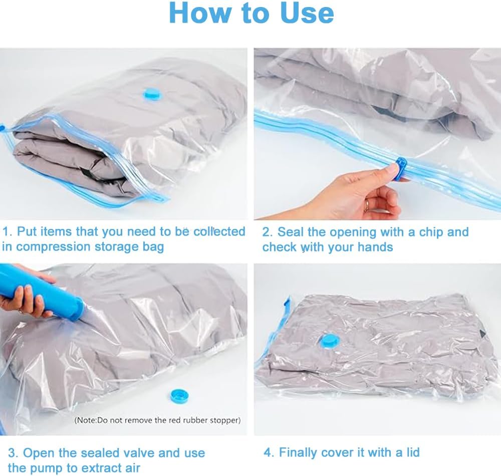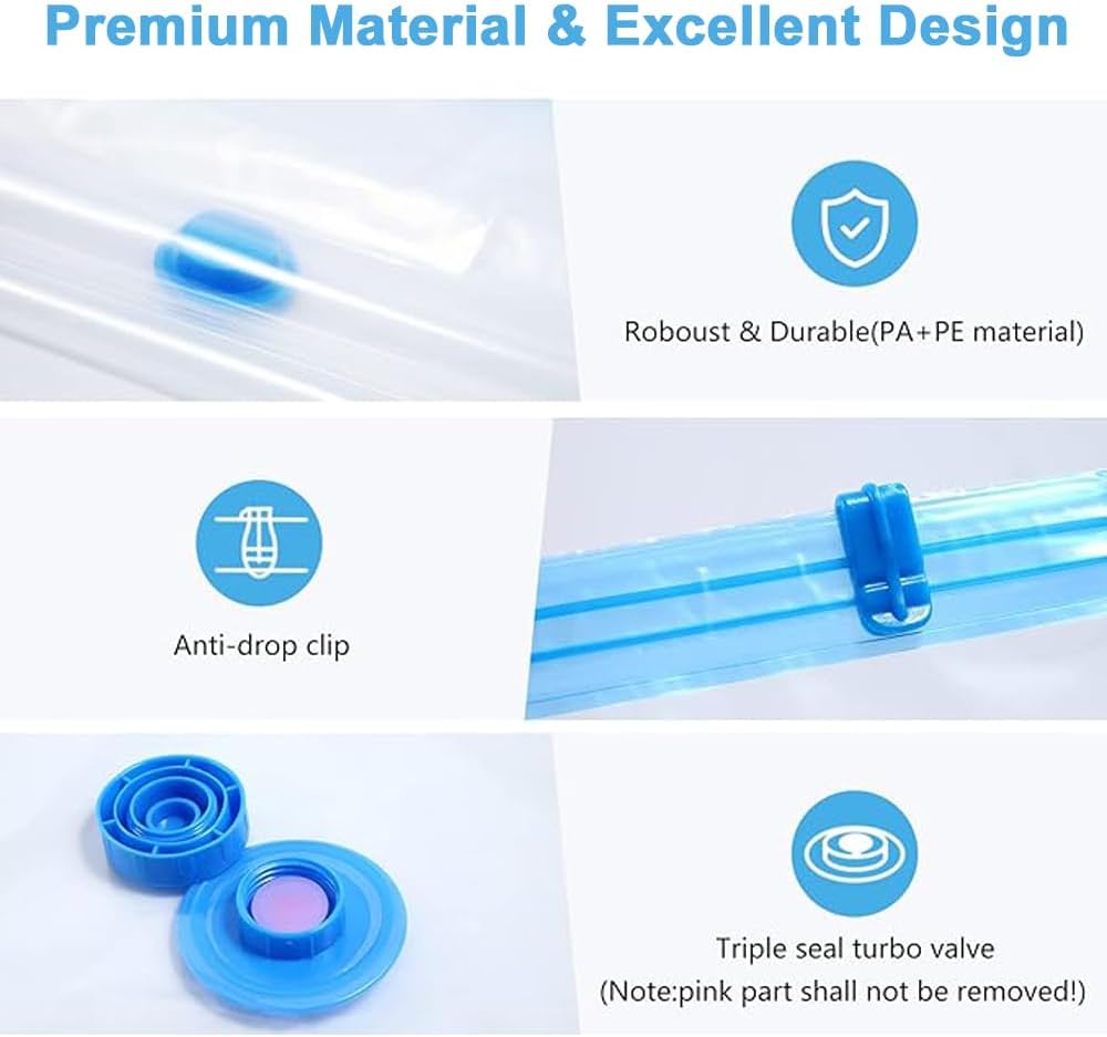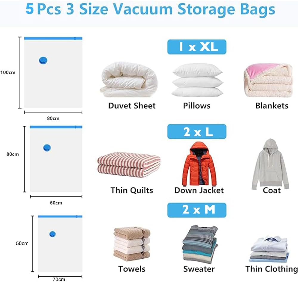 HEXAR Vacuum Storage bags with Hand Pump, 5 pack Space Saver Bags (1 XL, 2L, 2M) for Home and Travel, Reusable Compressed Air Storage Bags for Clothes