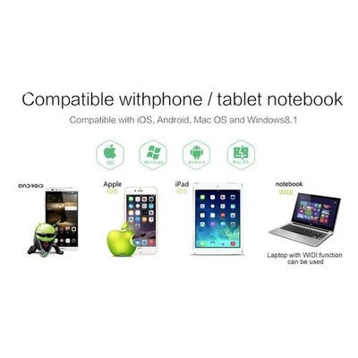 This WiFi display dongle receiver applies to LCD/TV/Projector with HDMI interface sharing picture/video/music of IOS devices, Android smartphones, tablet PCs, etc. With this item, you can play fluently 1080P movies and games on large screen.